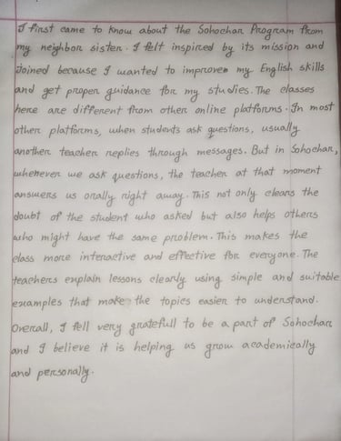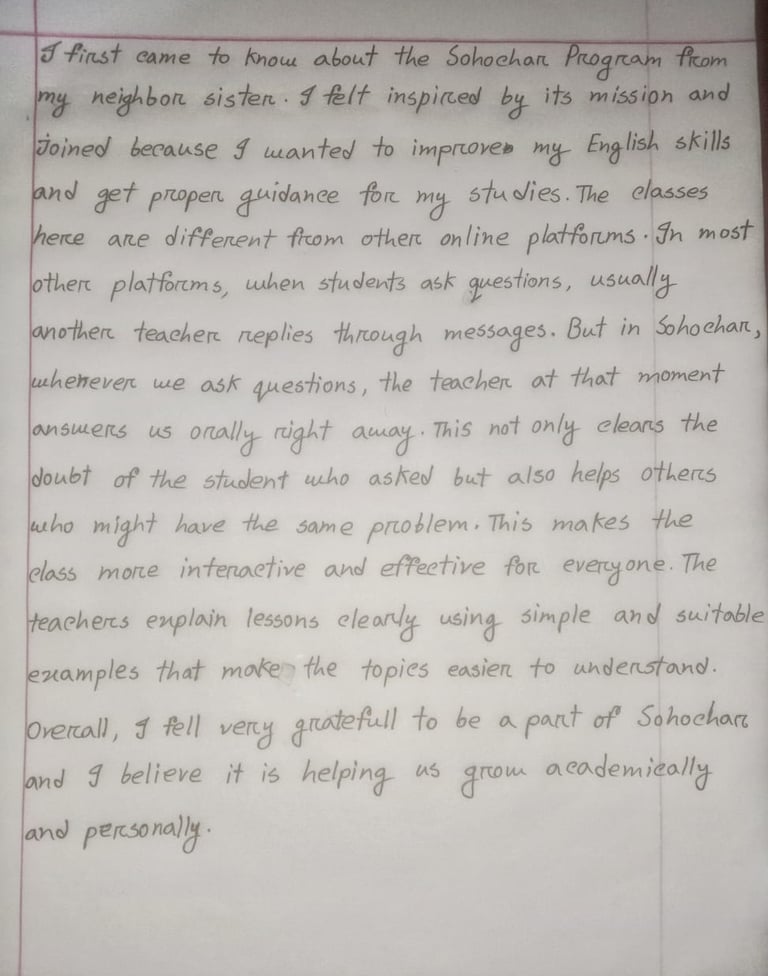 ”I first came to know about the Sohochor Program through my friend/classmate. I joined because I wanted regular guidance and support in my studies. Compared to other places, I found the classes here more interactive, and the teachers are very patient in answering our questions. The regular practice and monitoring system also make learning easier.
